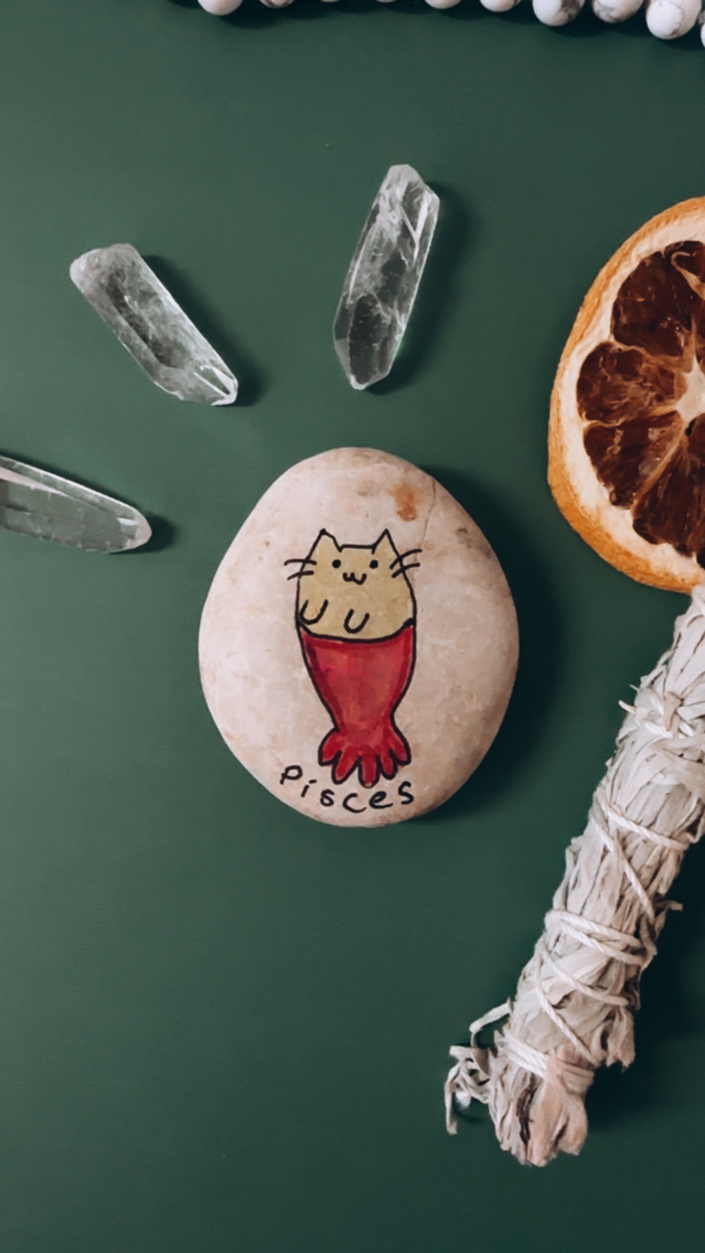 Bring a little cosmic magic into your pocket, altar or home with these hand-painted Kitty Stone. Each stone is lovingly illustrated with a whimsical kitty embodying the energy of the zodiac, making them the sweetest companions for your star sign (or as a thoughtful gift for the astrology lover in your life)